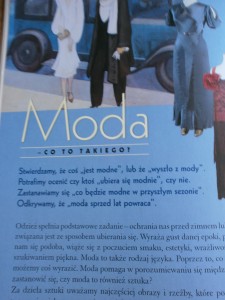 W rozdziale „Moda – co to takiego” autorka napisała: „…moda – jest wypowiedzią artystyczną, potrzeba bowiem wiele wyobraźni, talentu, dyscypliny, aby kreować ubiory”.