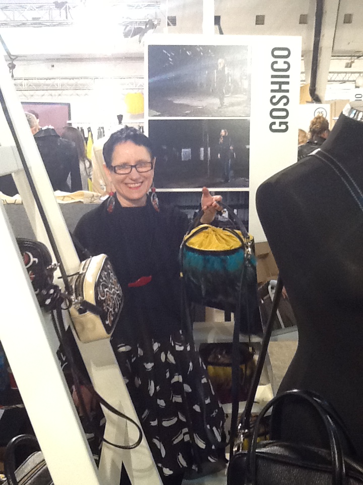 Musiałam odwiedzić stoisko Goshico i dotknąć torby. Na zdjęciach: ja na tle stoiska i z jedną z toreb projektu Goshico.