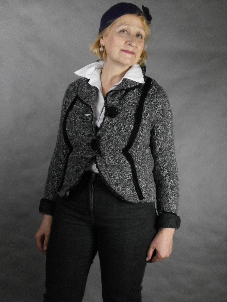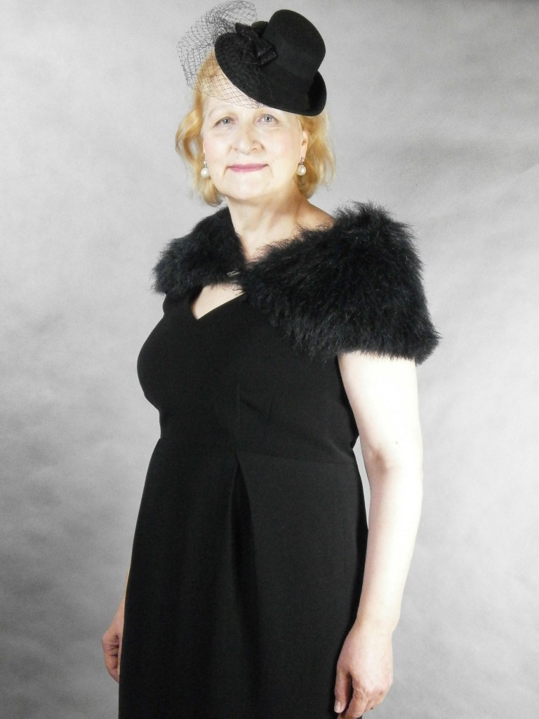 Czarna sukienka przywieziona z Londynu, kołnierz – prezent, stroiki wypożyczone od Avangardy