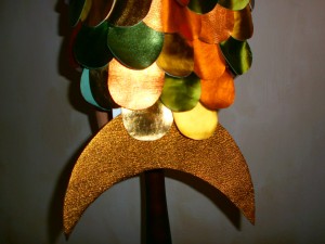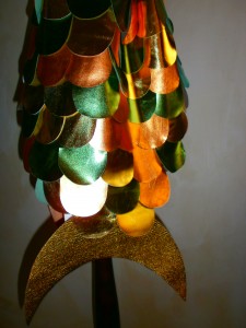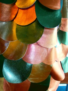 Cacko, skórzana torba w kształcie ryby – błyszczące łuski i płetwa, a głowa koloru zielonego ściągana sznurkiem.